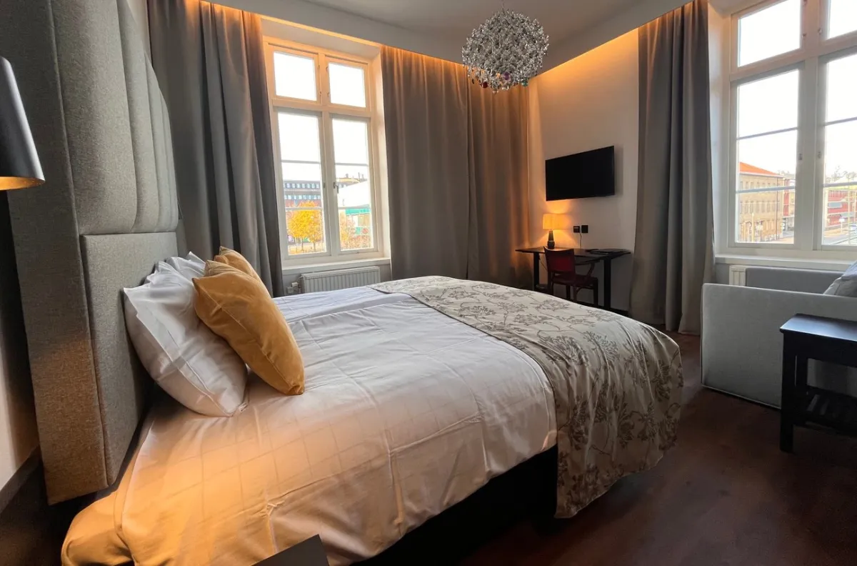Vårt Superior Corner Dubbelrum på 25 m² erbjuder rymligt boende med en bekväm dubbelsäng och högt i tak. Rummet ligger i ett hörn, vilket ger extra ljus och en luftig känsla. TV och gratis WiFi ingår.